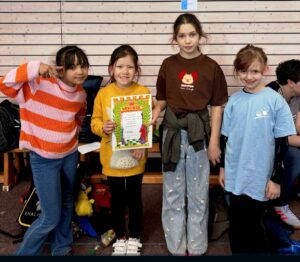 Nach sechs Durchgängen wurde es richtig spannend. Zuerst wurden die 3 Erstplatzierten Mädchen und Jungen der jeweiligen Altersklassen prämiert: Ella aus Klasse 1 erkämpfte sich die Goldmedaille! Zweiter wurde Carl bei den Jungen. Carolina wurde Erste in der Altersstufe der 2. Klassen! Da wurde natürlich kräftig gejubelt! Auch in der Schulgesamtwertung ging es ganz schön knapp zu. Alle warteten gespannt auf das Ergebnis- und dann kam der große Moment: unsere Schule gewann den 1. Platz
